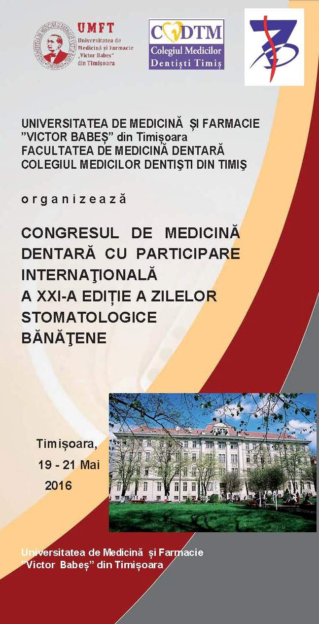 Facultatea de Medicină Dentară a Universităţii de Medicină şi Farmacie "Victor Babeş" din Timişoara, în colaborare cu Colegiul Medicilor Dentişti din Timiş, organizează Congresul cu Participare Internaţională "Zilele Stomatologice Bănăţene", cea de a XXI-a ediţie, care va avea loc în perioada 19-21 mai 2016 la Timişoara, în Aula Magna a Universităţii de Medicină şi Farmacie "Victor Babeş" din Timişoara.